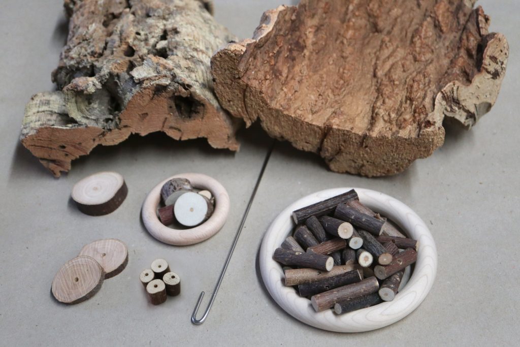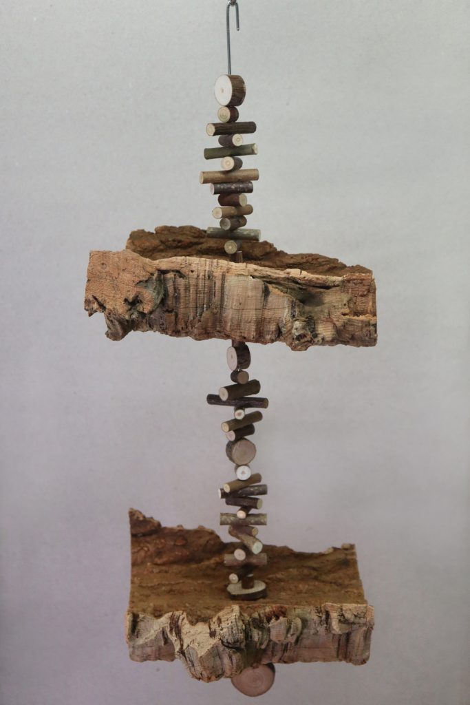 Unten sind zwei Varianten zu sehen: Rechts sind beide Korkbrettchen mit der Außenseite der Rinde nach unten aufgefädelt. Bei der Schaukel links ist das obere Brett mit der Rinde nach oben.