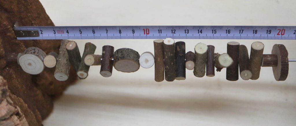 Unter dem Korkbrett mit einem zweiten Stopper fixieren und weiter auffädeln. Abstand zum nächsten Brett mindestens 15 besser 20 cm, um Höhlencharakter zu vermeiden!