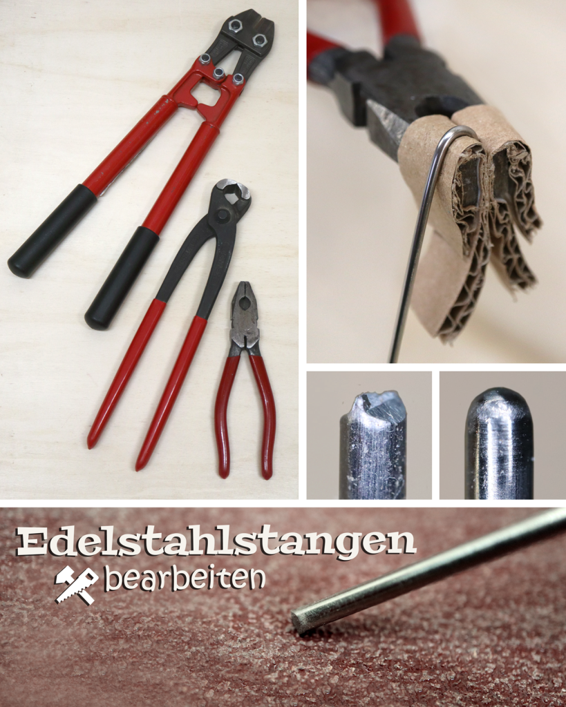 Zunächst alles Material bereitlegen und vorbereiten. Die Äste entsprechend ablängen, genau wie die Stangen aus Edelstahl. Damit die Verarbeitung im weiteren Verlauf einfacher ist, bitte diese Grundlagen beachten und anwenden: