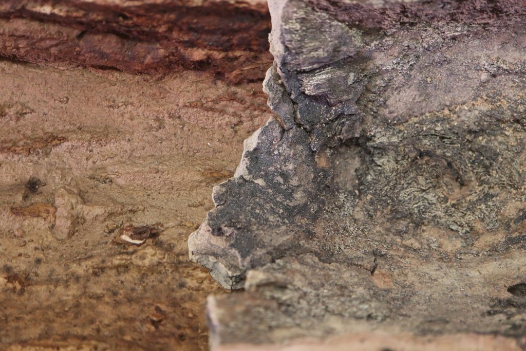 Links vom lebenden Baum geschält, rechts von einem toten Baum mit Holzresten, die Schimmelbildung begünstigen.