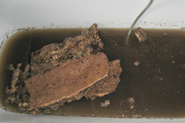 Ein Stück Kork vor der Reinigung. Bei den dunklen Anhaftungen handelt es sich ziemlich sicher um Feinstaub/Ruß, den ich in meiner Gegend auch auf Holz finde. In anderen Gegenden ohne Verkehr schaut das nicht so aus!